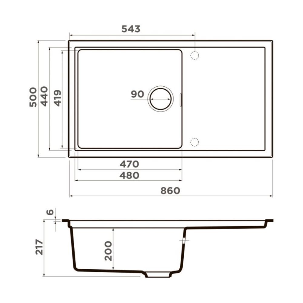 Мойка кухонная Omoikiri из коллекции Sintesi 86-WG имеет размеры 860х500 мм., изготовлена из искусственной керамики. Форма — прямоугольная, одна чаша без отверстия для смесителя. Сифон в комплекте. Ширина чаши 47. Врезной монтаж. Имеется крыло.
