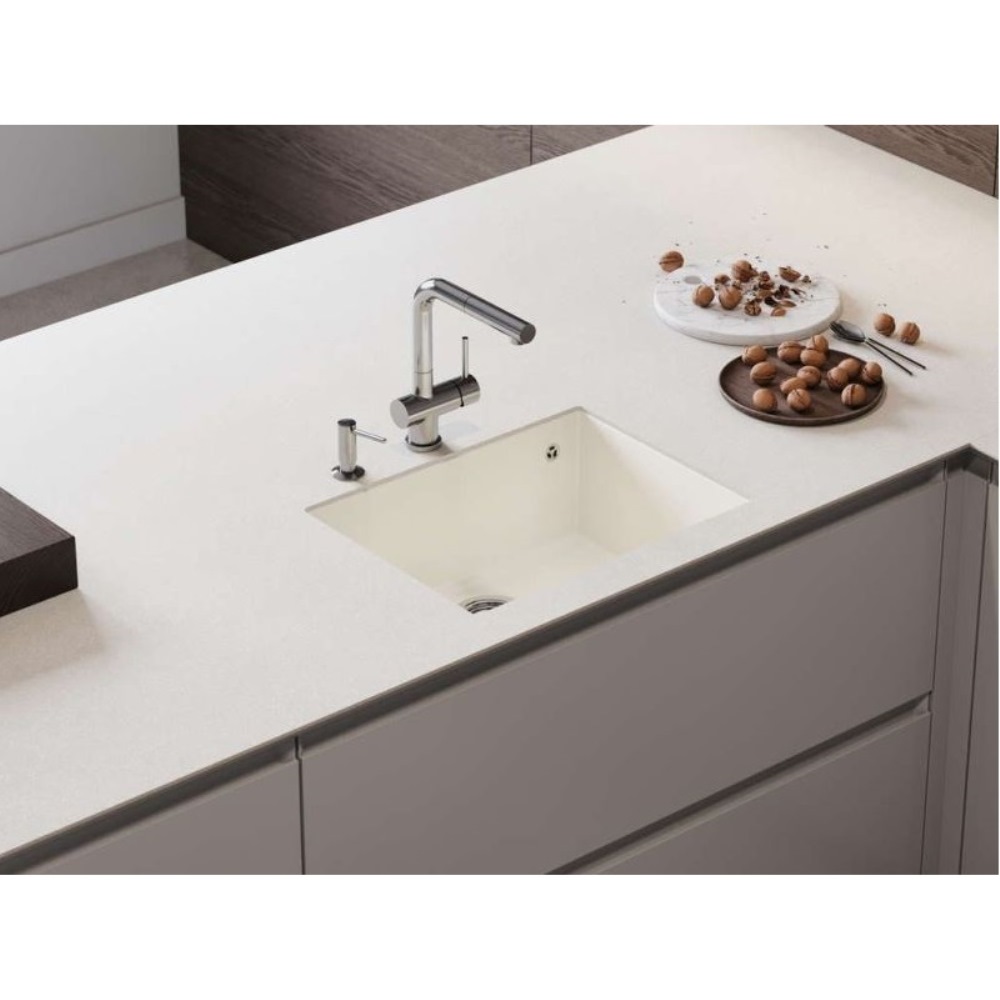 Мойка кухонная Omoikiri из коллекции Tedori 54-U-BE имеет размеры 550х420 мм., изготовлена из искусственного гранита. Форма — прямоугольная, одна чаша без отверстия для смесителя. Сифон в комплекте. Ширина чаши 51. Подстольный монтаж.