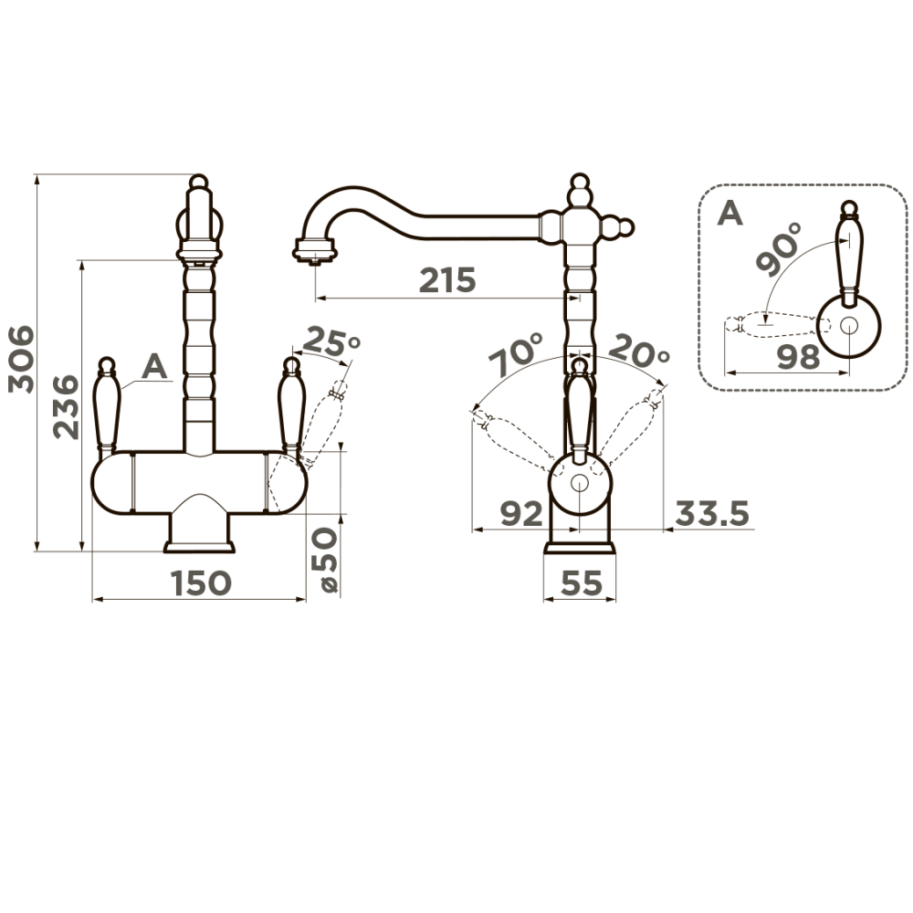 Смеситель для кухни Omoikiri Amagasaki с подключением фильтра оснащен рычажным управлением для регулировки температуры и напора воды. Горизонтальный монтаж на 1 отверстие. Поворотный излив 215 мм.